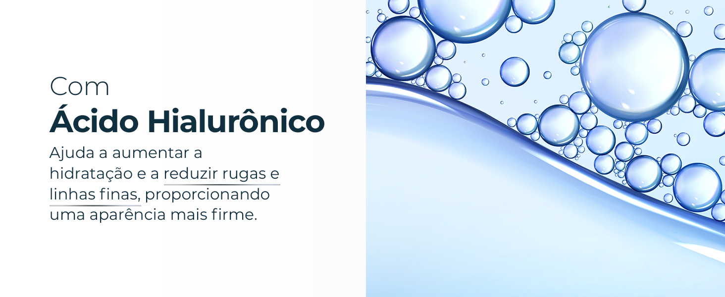 | Benefícios do produto | HIDRATAÇÃO INTENSIVA IMEDIATA: Glicerina reforça a hidratação por 24h; PREENCHE RUGAS E LINHAS FINAS: Ácido Hialurônico altamente concentrado; TEXTURA ULTRALEVE E REFRESCANTE: rápida absorção sem pesar; PELE FORTALECIDA: fortalece a barreira natural da pele; RESULTADOS VISÍVEIS EM 2 SEMANAS*. |