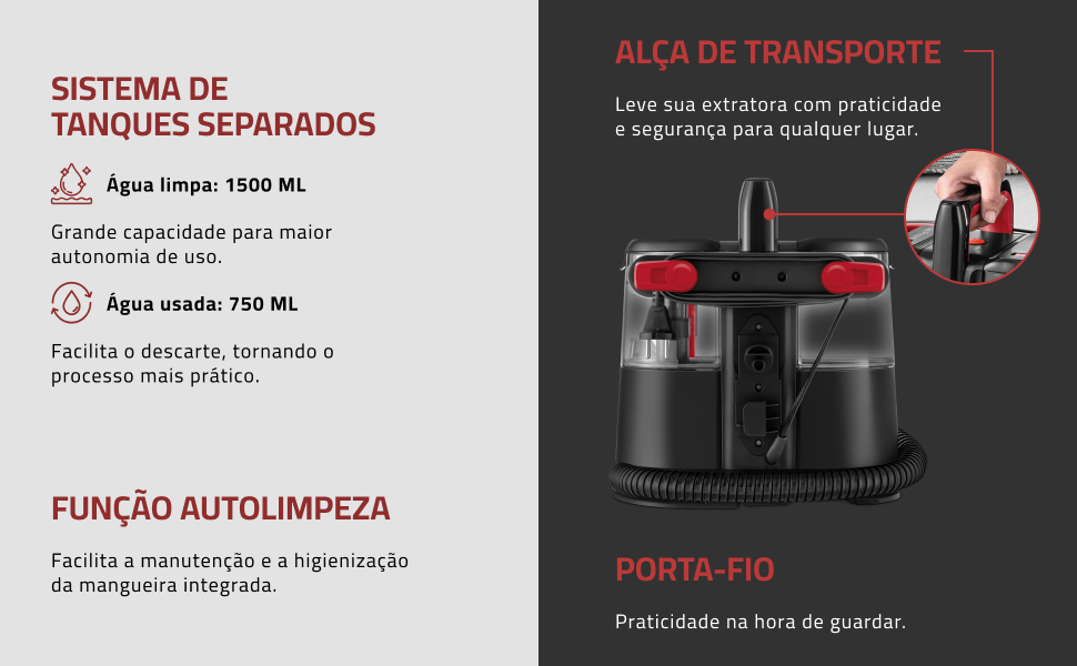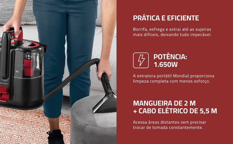 Com mangueira flexível de 2 metros e cabo elétrico de 5,5 metros, a extratora permite acesso a áreas distantes sem necessidade de trocar constantemente de tomada. A alça de transporte e o porta-fio integrado garantem máxima praticidade no uso e armazenamento.