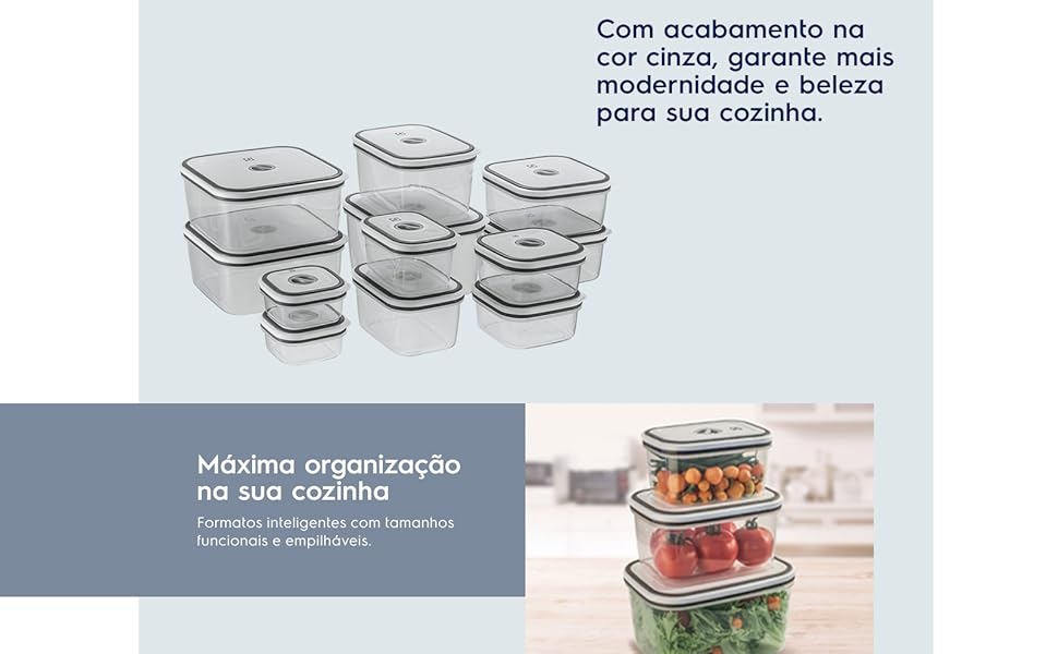 A vedação hermética prolonga significativamente a vida útil dos alimentos, reduzindo desperdícios e mantendo a qualidade nutricional. Ideal para organizar geladeira, despensa e facilitar o preparo de refeições.