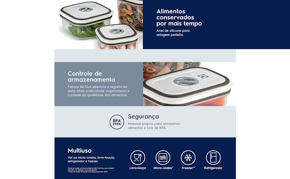 O sistema de fechamento hermético garante vedação perfeita, preservando a frescura natural dos alimentos por períodos prolongados. Esta tecnologia impede a entrada de ar e umidade, mantendo sabores e nutrientes íntegros.