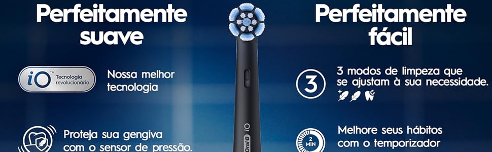 A tecnologia magnética iO combina cabeça redonda com microvibrações sincronizadas, oferecendo movimento mais suave e harmonioso comparado às vibrações lineares das escovas sônicas tradicionais.