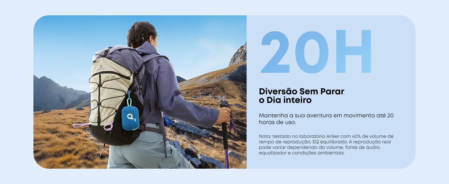 20 horas contínuas de reprodução com carregamento via USB 5V