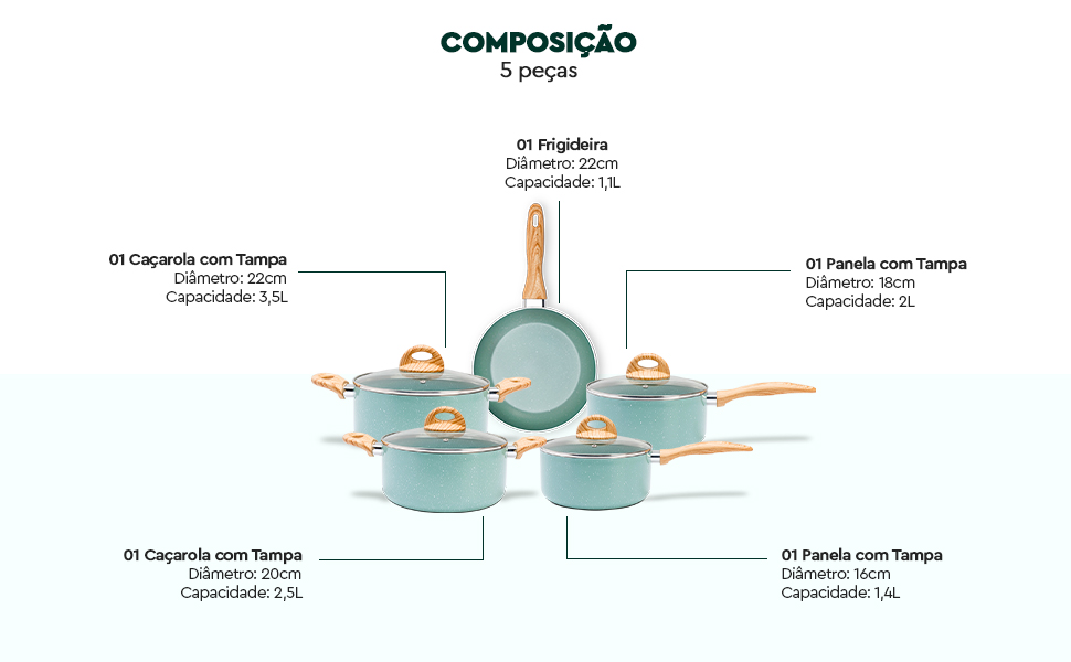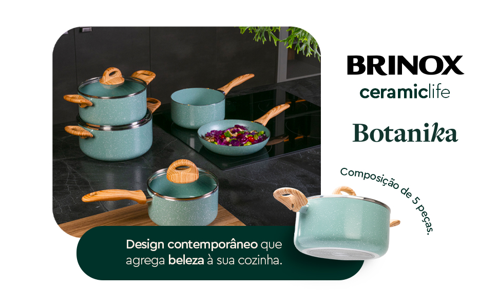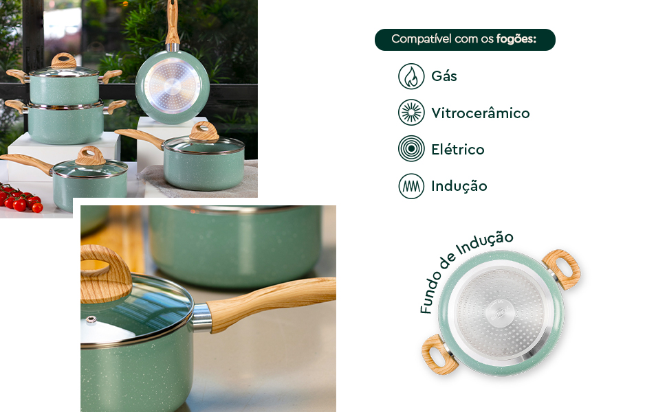 Os cabos e alças em baquelite soft-touch apresentam efeito amadeirado, oferecendo conforto e segurança no manuseio. As tampas em vidro temperado são equipadas com saída para vapor, permitindo o controle visual do cozimento.